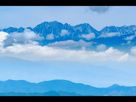 Telephoto shot of the Japanese Central Alps taken from the peak of Mt. Nyukasa. The tallest peak in the Central Alps, Mt. Kisokoma, rises to an elevation of 2,955 m (9,698 ft). These alpine peaks are located in Nagano Prefecture, approximately 241 km (150 mi) northwest of Tokyo.